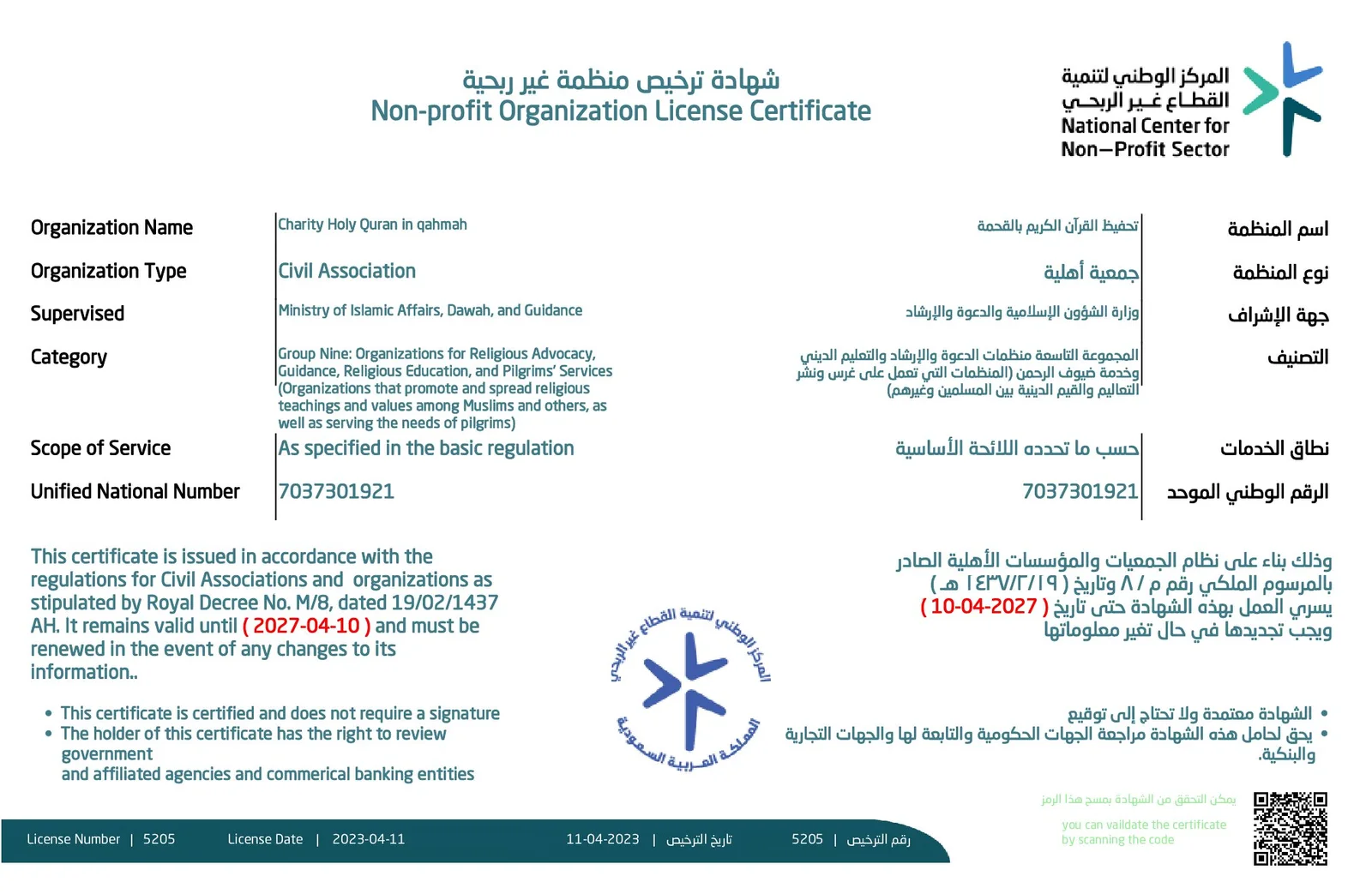 عن الجمعية عن الجمعية جمعية تحفيظ القرآن الكريم بالقحمة، جمعية أهلية غير ربحية تحت إشراف المركز الوطني لتنمية القطاع غير الربحي، مسجلة برقم (5205)، تهدف إلى تحفيظ وتعليم المسلمين كتاب الله تعالى حفظاً وتلاوة وتجويداً. الرؤية الرسالة الأهداف الجمعية في أرقام معلم ومعلمة حلقة قرآنية طالب وطالبة